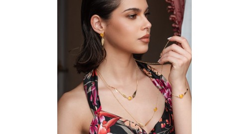 Gli Orecchini petit bouquet - Boho chic sono disponibili nella rifinitura in argento dorato lucido e sono costituiti dai toni del giallo citino e del verde labradorite.