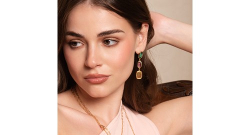 Gli Orecchini bouquet - Boho chic sono disponibili nella rifinitura in argento dorato lucido e sono costituiti dai toni del verde peridoto, giallo citino e del verde labradorite.