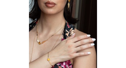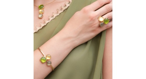 Il Bracciale bouquet - Boho chic è disponibile nella rifinitura in argento dorato lucido ed è costituito dai toni del verde peridoto, giallo citino e del verde labradorite.