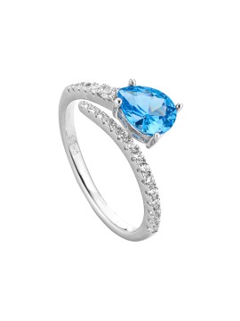 L'Anello goccia azzurra contrariè - Emme è costituito da una luminosa pietra azzurra e da un pavè di zirconcini.