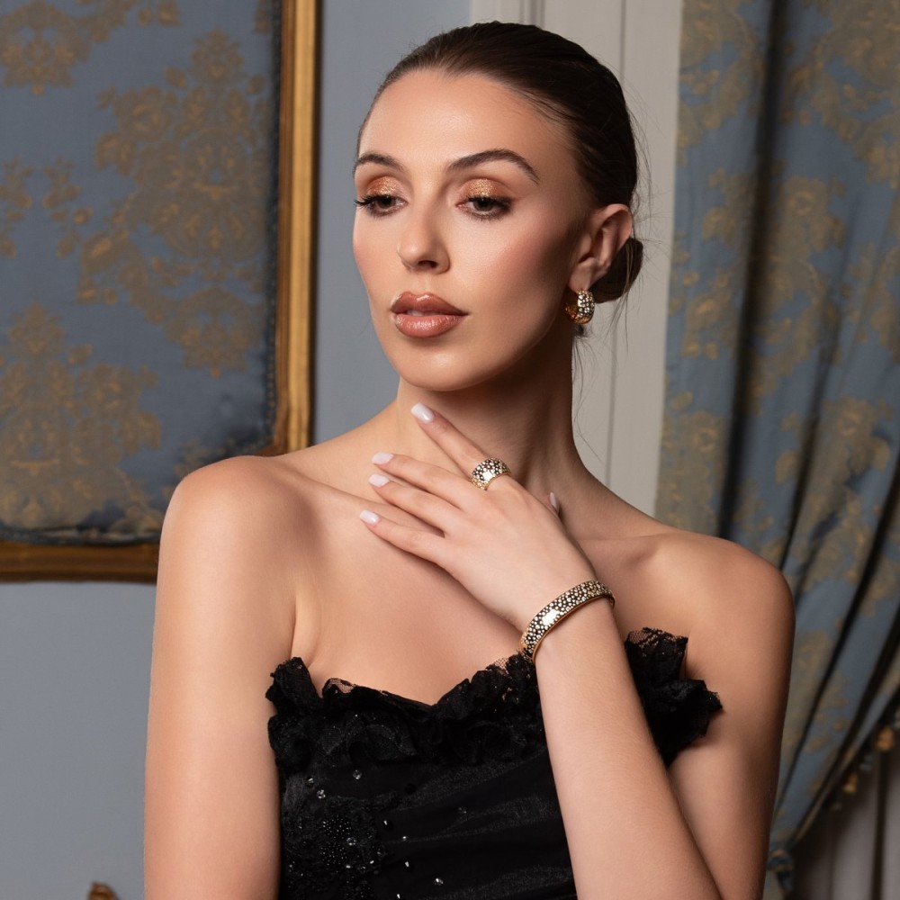 Il bracciale rigido Venice è disponibile nella colorazione oro lucido con zirconi bianchi incastonati. Il diametro è di 6cm.