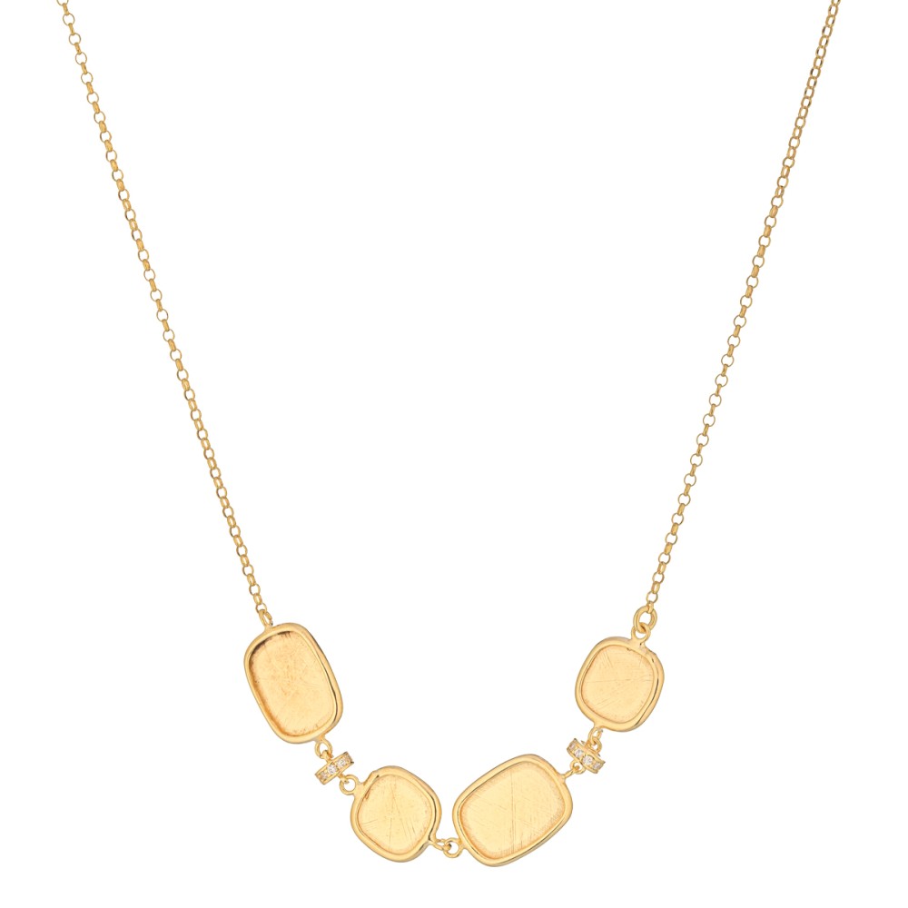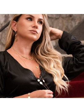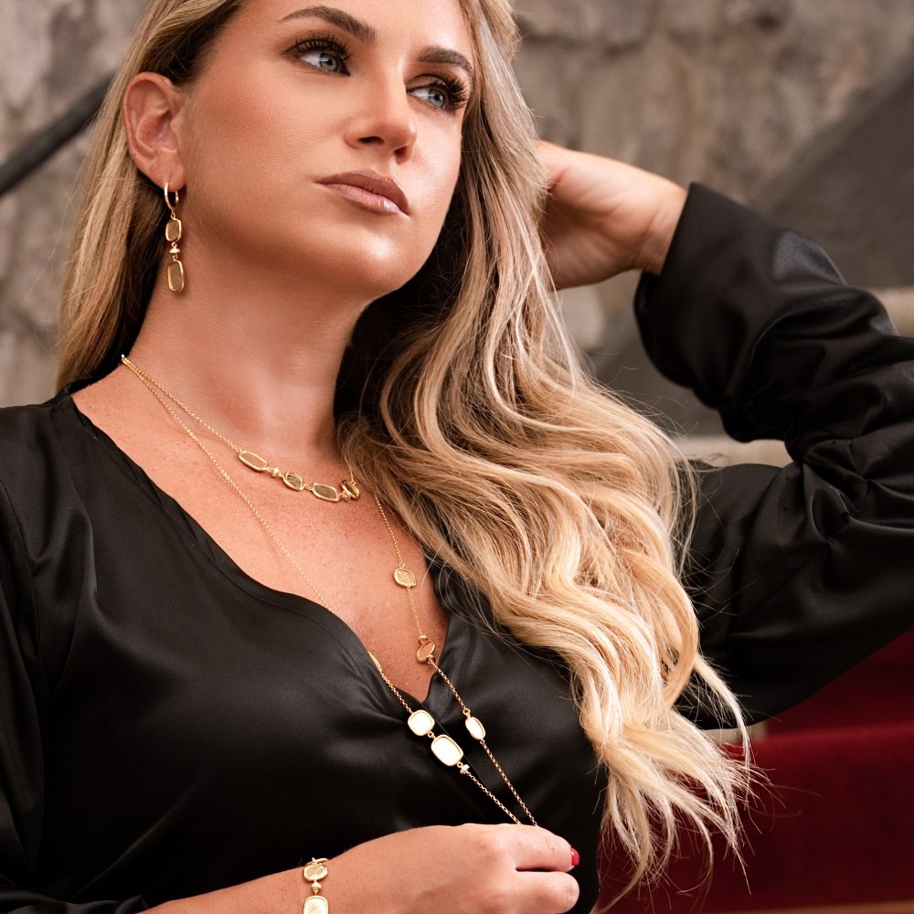 La collana sagome longuette misura 100cm ed è disponibile nelle colorazioni bianco argento e giallo oro.