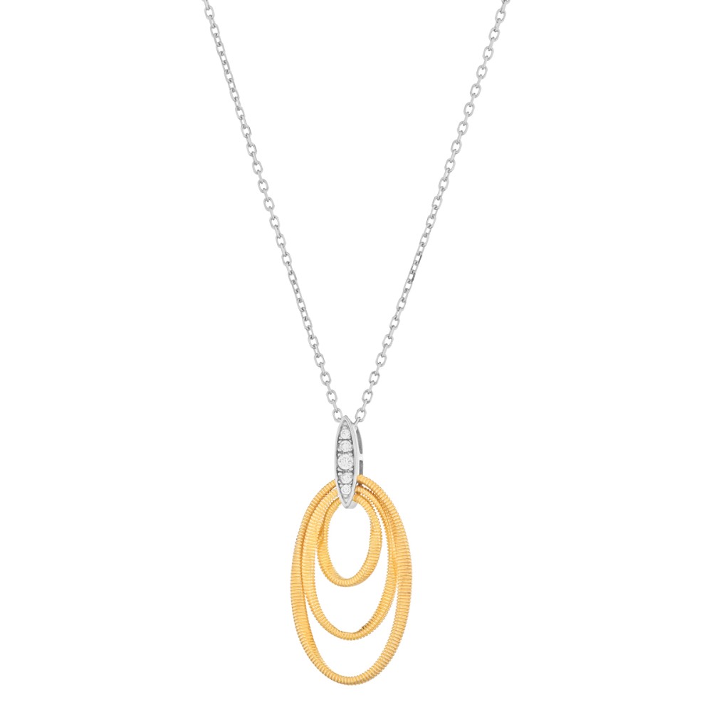 La collana cerchi vertigo - Twist è disponibile in colore argento e giallo o argento e brunito. La lunghezza totale è di cm 42+5 di estensione.
