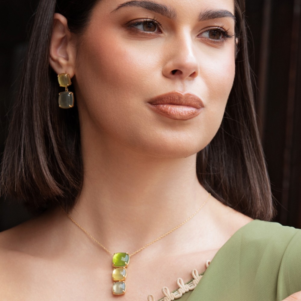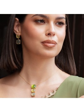 Gli Orecchini bouquet - Boho chic sono disponibili nella rifinitura in argento dorato lucido e sono costituiti dai toni del verde peridoto, giallo citino e del verde labradorite.